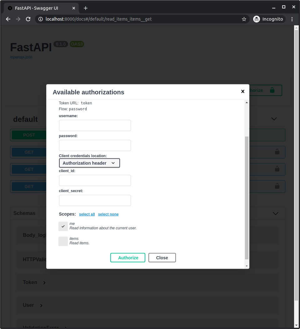 And if you select the scope me but not the scope items, you will be able to access /users/me/ but not /users/me/items/.