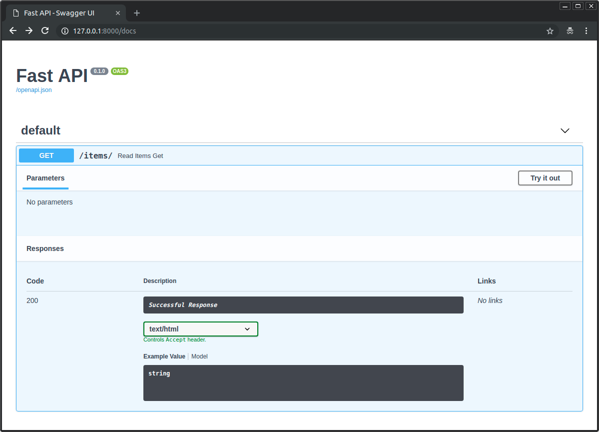 Aber da Sie die HTMLResponse auch in der response_class übergeben haben, weiß FastAPI, dass sie in OpenAPI und der interaktiven Dokumentation als HTML mit text/html zu dokumentieren ist: