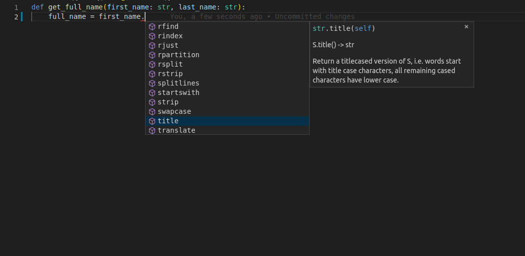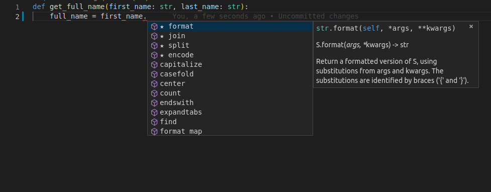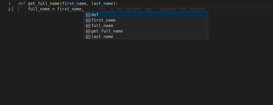 Sie geben den ersten Parameter der Funktion ein, first_name, dann einen Punkt (.) und drücken Strg+Leertaste, um die Vervollständigung auszulösen.